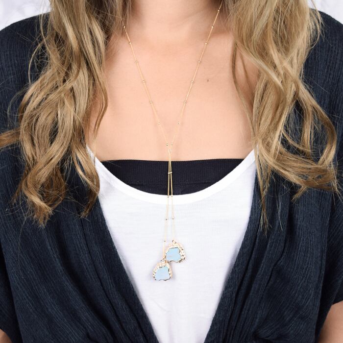 重ね付けも楽しめるロングデザインで、存在感ある2つの淡いターコイズストーンがコーディネートのアクセントに◎