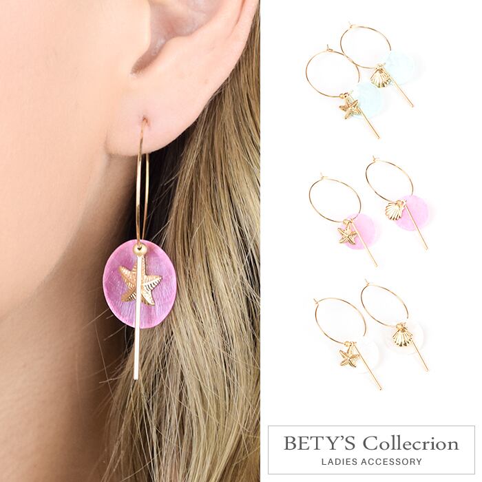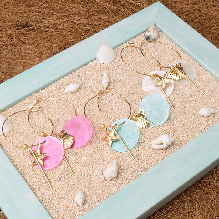 季節感あるシェルプレートのカラー使いが可愛いマリンフープピアス。